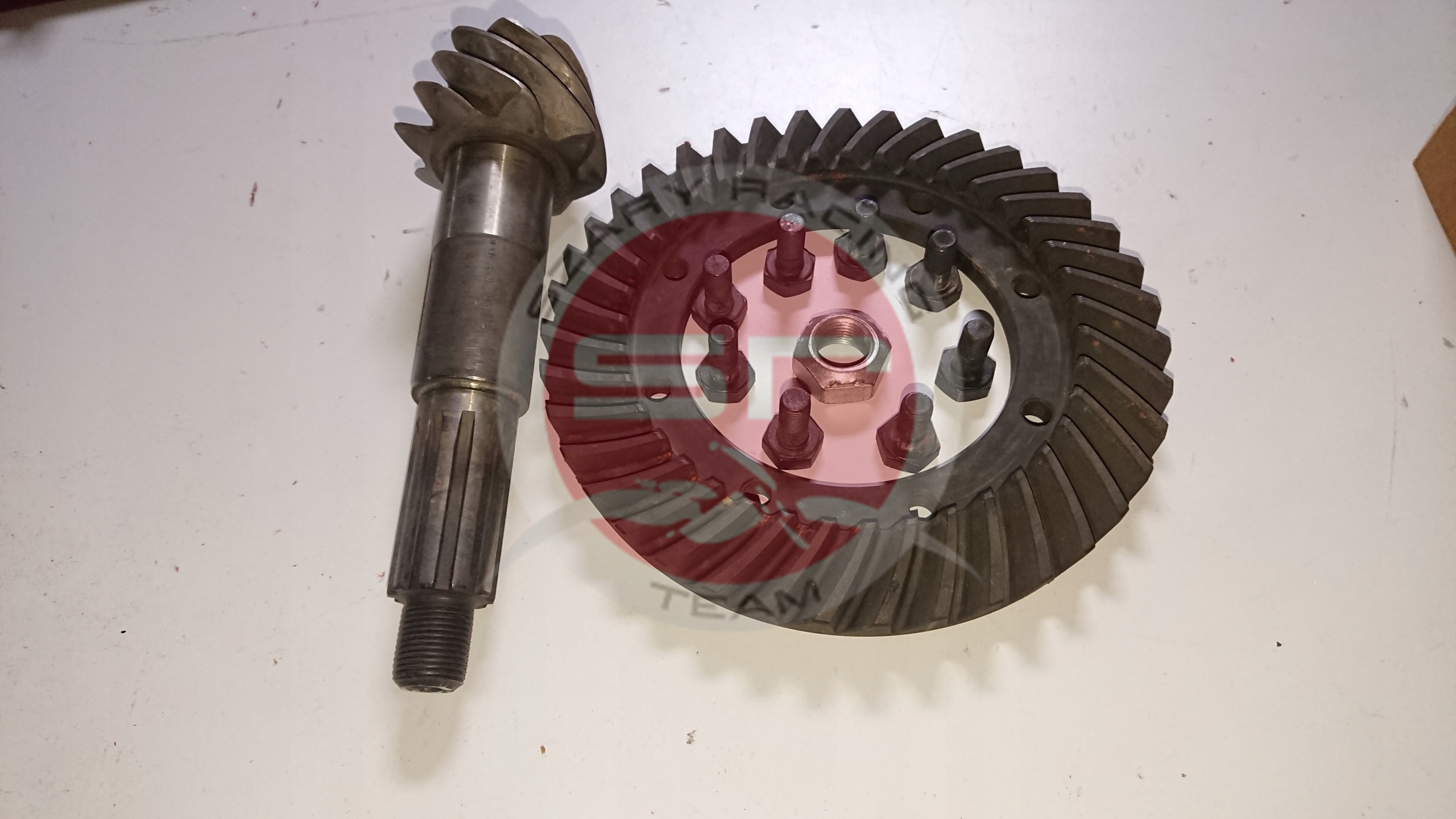 Willys MB Jeep M38 Ford GPW Oryginalny nowy zestaw przełożenia mostu napędowego SPICER USA . 39/8. Produkcja lata 40-te , 50-te. Zestaw zawiera wałek atakujący, koło talerzowe, śruby mocujące koło do kosza satelitów, nakrętka wałka atakującego.